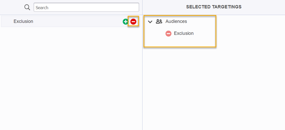 6. Set the audience you just created as an exclusion by clicking the red minus (-) icon next to the audience name. If done correctly, you should see it listed in the “Selected Tagetings” box.
