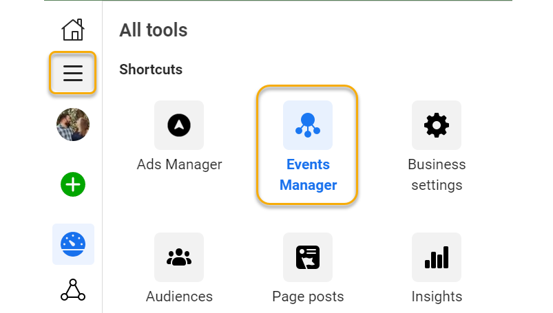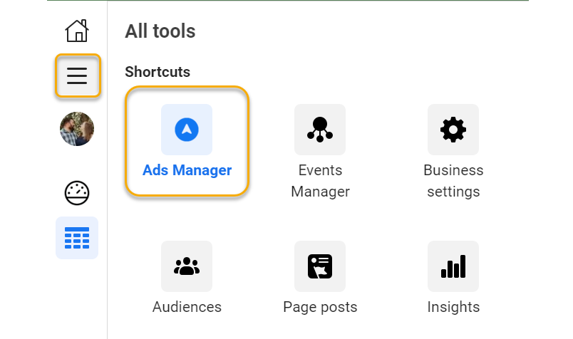 5. Go to the Campaigns Dashboard in Meta Business Manager by clicking the three lines above your profile picture on the left, then click on “Ads Manager”.
