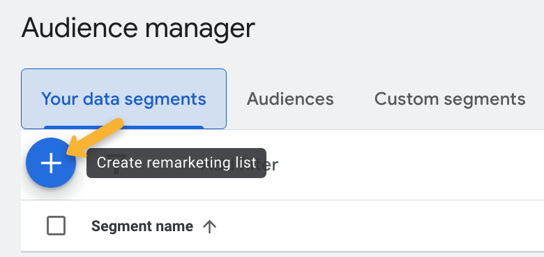 6. Once you have at least one data source listed, go to “Your data segments” on the left, then click the blue plus button to add a new remarketing list.
