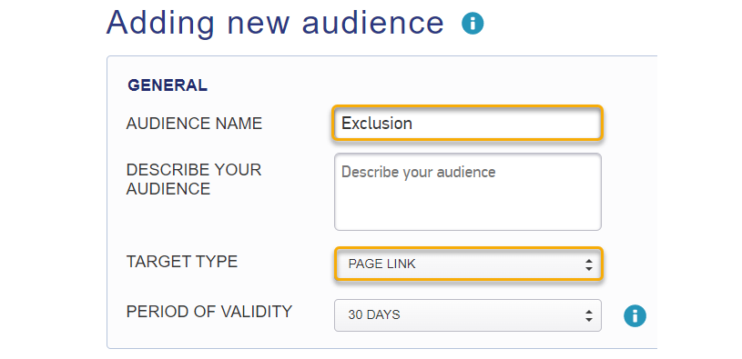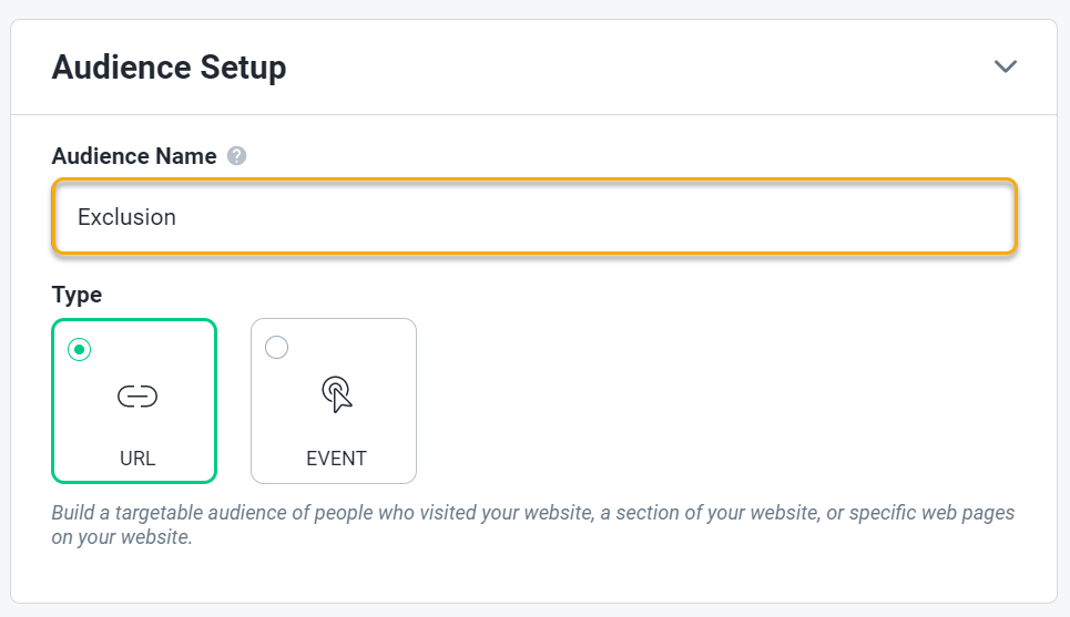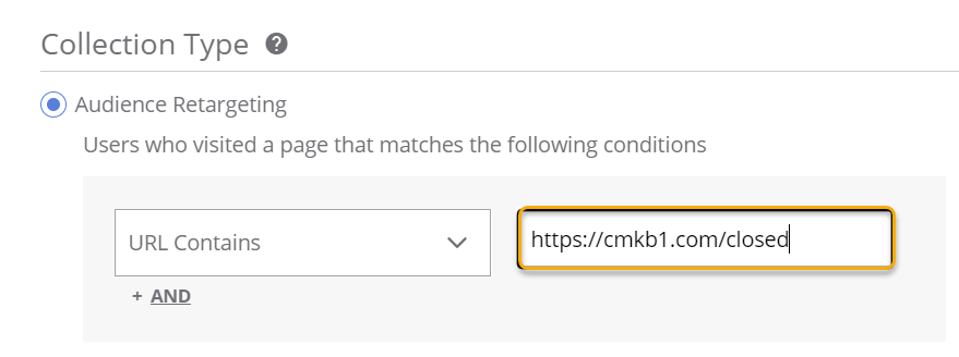 4. Then make sure the collection type is set to “Audience Retargeting”, and add the URL of your exclusion page in the box.