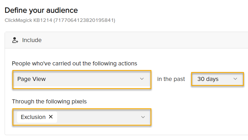 4. Use “Page View” as the action type, give it a time frame that fits your style, and then choose the Pixel you set up on your exclusion page.