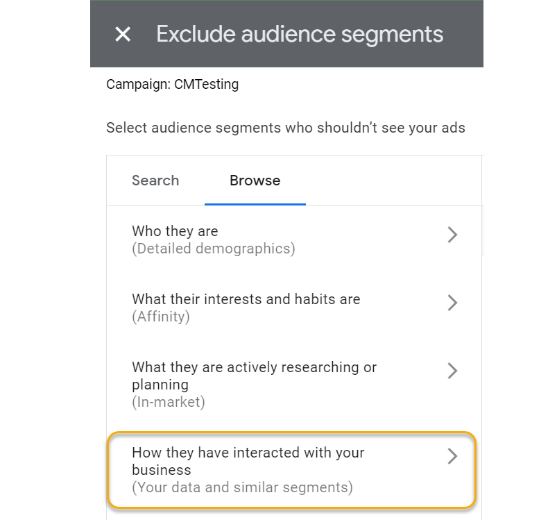 14. Choose “Campaign” as the option, then choose the campaign you want to set the exclusion in.