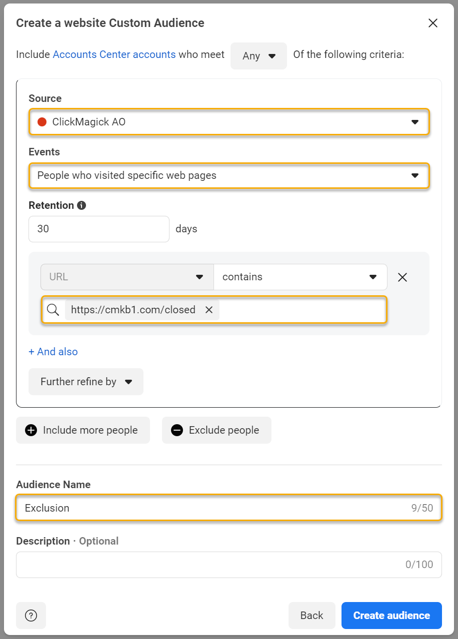 3. Choose the source you would like to use, choose “People who visited specific web pages”, and then add the URL of your exclusion page in the box. Lastly, give the audience a name and click “Create Audience”.