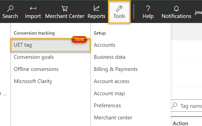 1. Go to your Microsoft Ads dashboard, click on the Tools menu, and then select “UET Tag”.