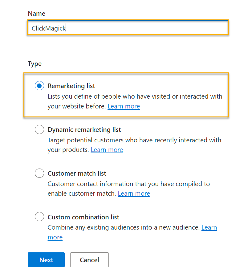 4. Give your new audience a name, and then choose “Remarketing List”.