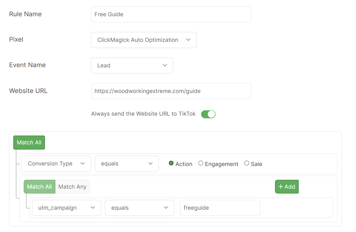 If a conversion doesn’t match the advanced rule you have set, it will use the default rule. For TikTok Ads, the default rule is what you initially set up for either Actions, Engagements, or Sales in the Audience Optimization setup.
