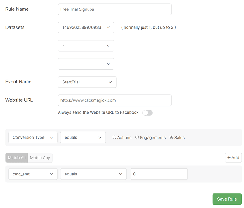 Advanced Rules allow you to set up almost infinitely flexible rules to determine how your conversions are sent back to your ad network based on Conversion Type, UTM Values, and even Sales Amounts.