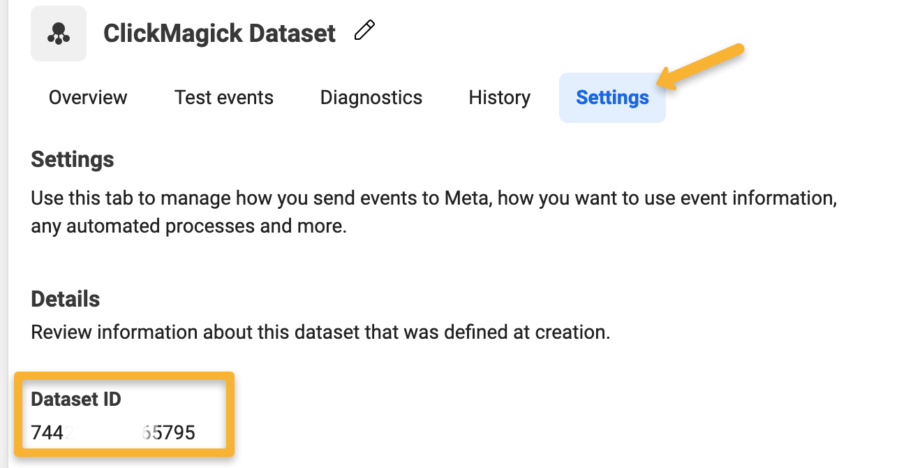 You should see your new Dataset listed on the Events Manager Overview page. Click on the Dataset you just created, then open its Settings tab and copy the Dataset ID from there.