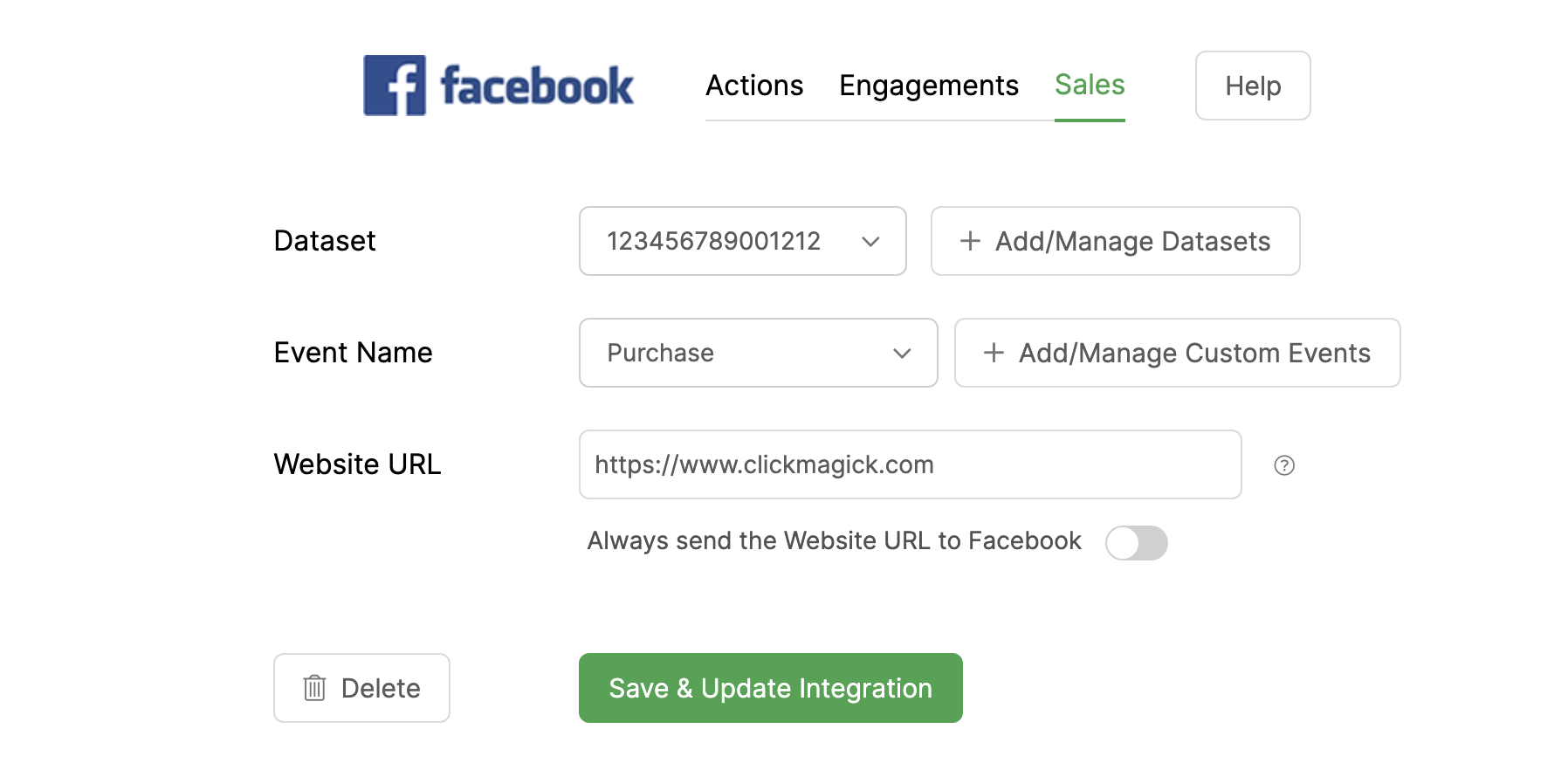 Note: We’ll always pass the URL where a conversion occurred to Facebook’s API when one is available. When no URL is available — for example if you’re tracking affiliate sales via Postbacks — we’ll simply pass the Website URL you entered when you saved your dataset settings.