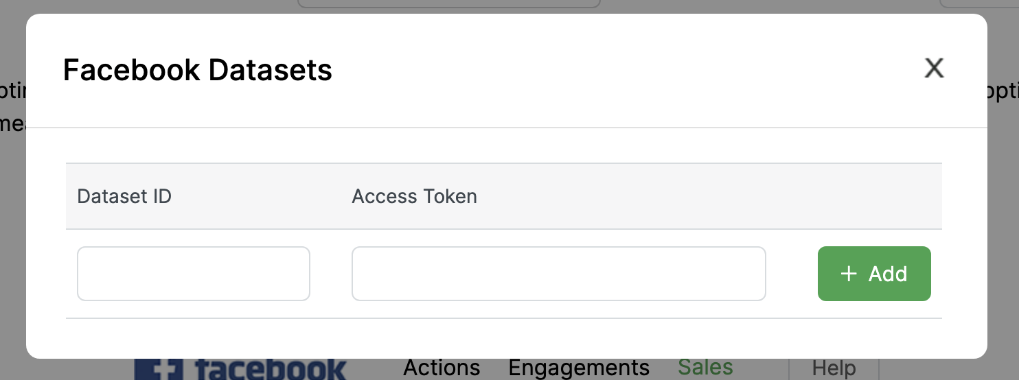 If this is your first time adding a Facebook Dataset you’ll see this screen. Enter your Dataset details to continue …