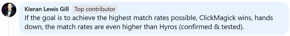 For example, when sending conversions to Facebook you can send up to 15 customer data points. ClickMagick lets you send all 15, but Hyros only sends 6.