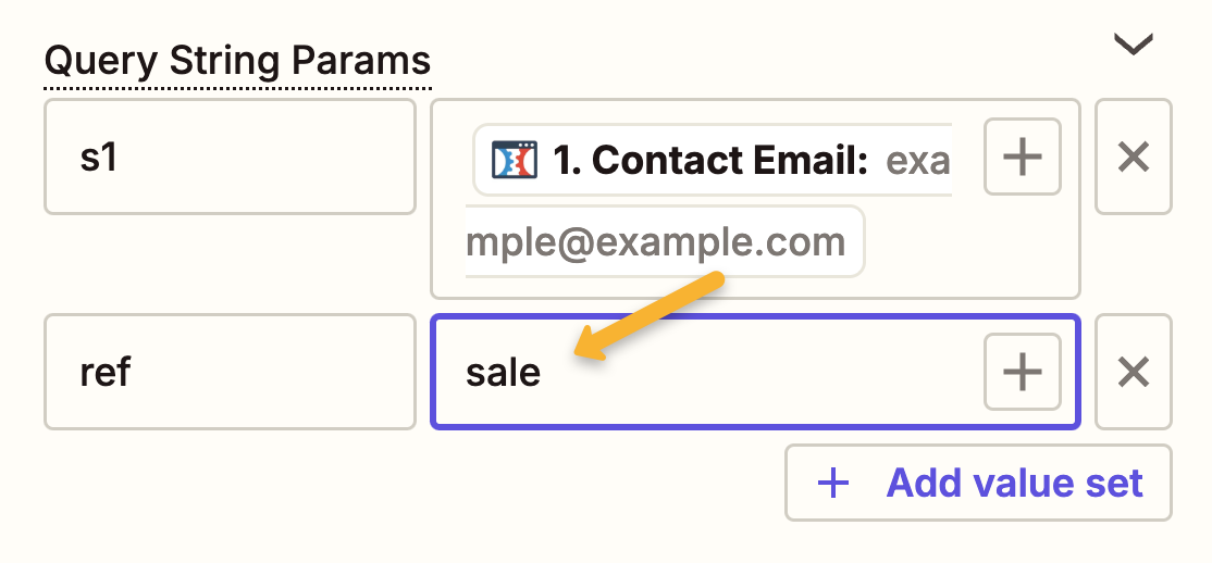 Next, under “Query String Params”, enter s1 into the first box. Then click the “+” icon next to “Enter text or insert data”.