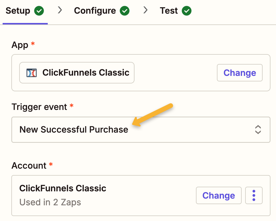 For the “Trigger event”, select the conversion event you want to send to ClickMagick. In our example, it’s going to be “New Successful Purchase”.