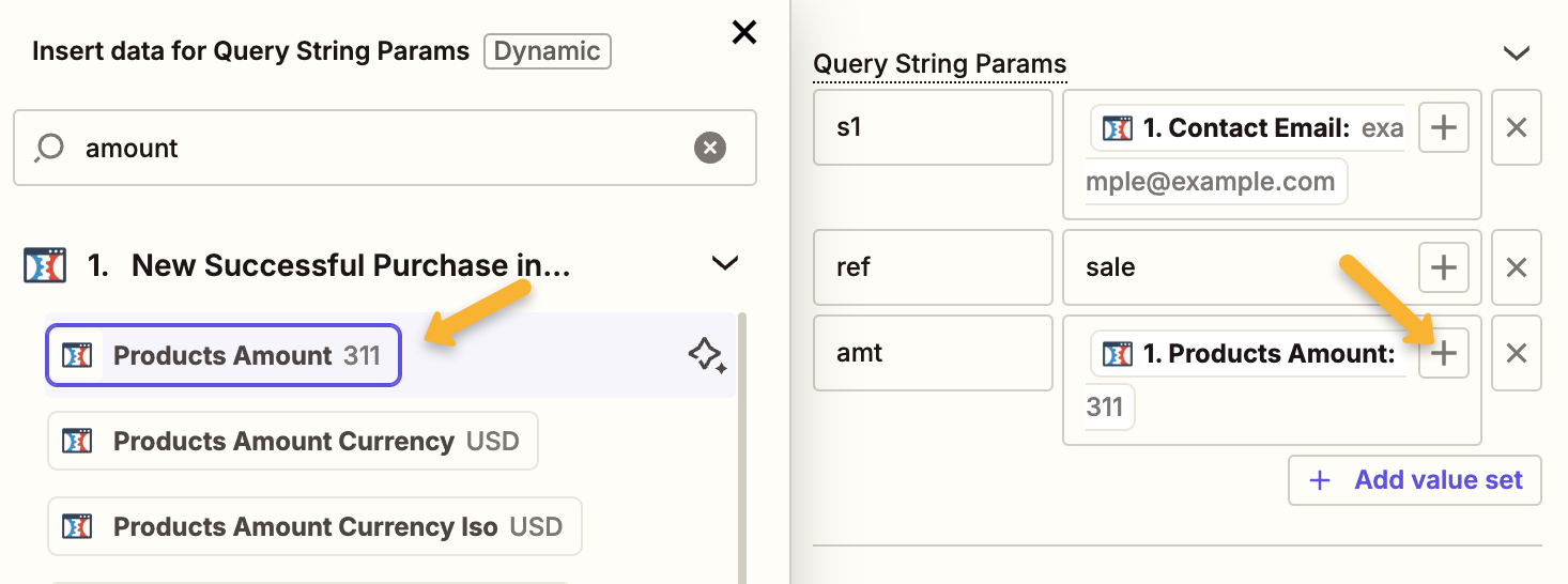 If you’re tracking a Sale, click on “+ Add value set” and add amt in the left hand box.
