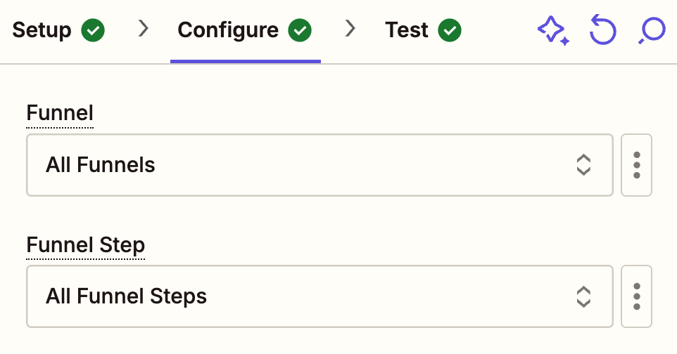 The options you see under “Configure” will differ depending on the app you’re using. It’s usually where you select which funnels or pages you want to be included in this trigger.