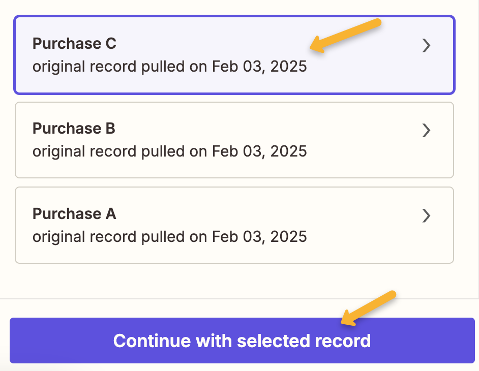 Select any one of these records to use as a test and click “Continue with selected record”.