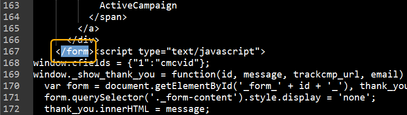 13. You’ll need to find the “script” portion to remove. Bring up the find command again and search for “/form”. When you find it, then you will need to remove everything AFTER </form>.