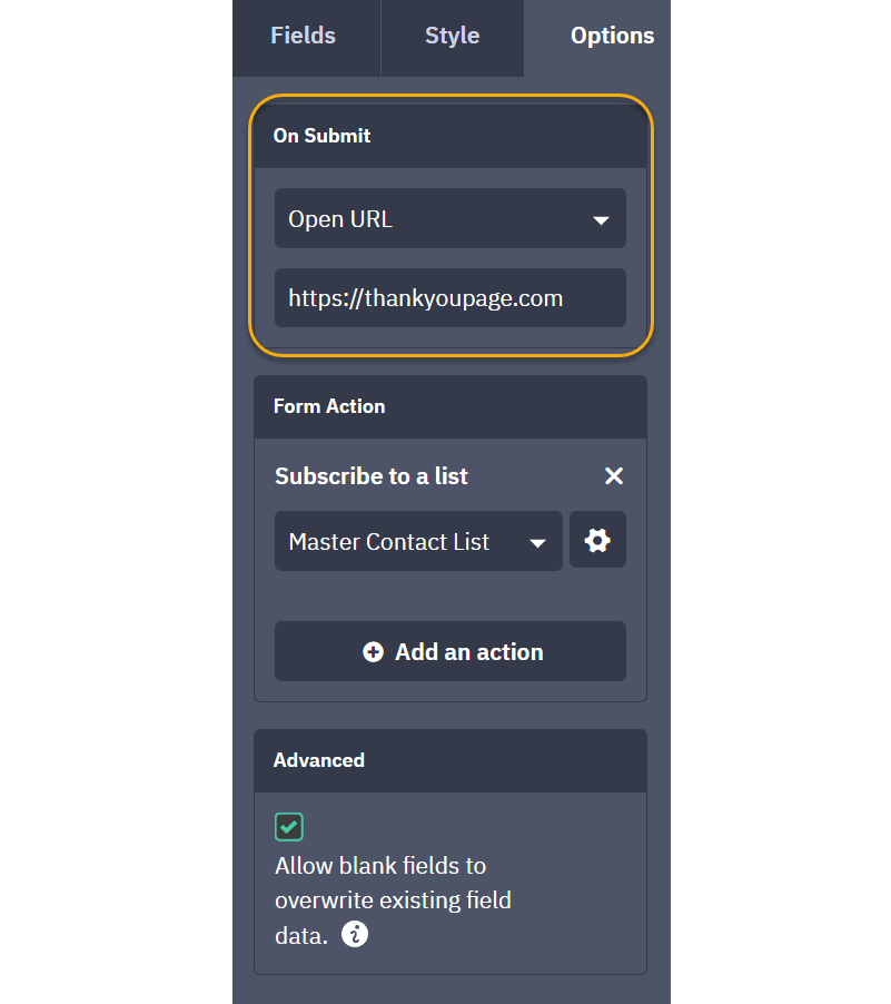 8. Click off the page and then go back to the right side. Click on the “Options” tab, and then update the “On Submit” values to “Open URL” and put your thank you page in the box for the URL.