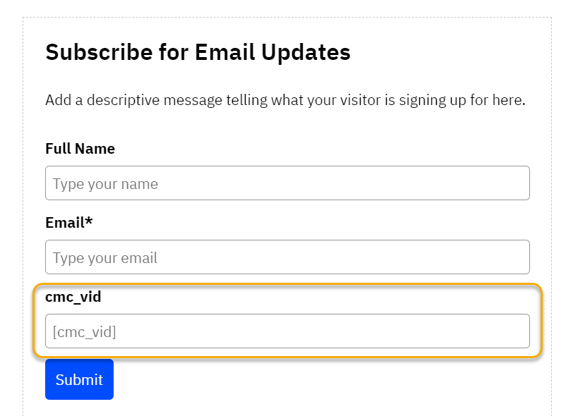 On the right side, you’ll see a “Custom Fields” section. Find the “cmc_vid” field and drag it over to your form.