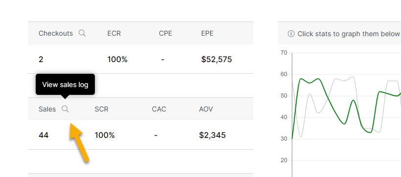 You can easily view your click and conversion logs at any time. Just go to your Project Dashboard, then click the magnifying glass icon next to Clicks or any conversion type to view the corresponding log.