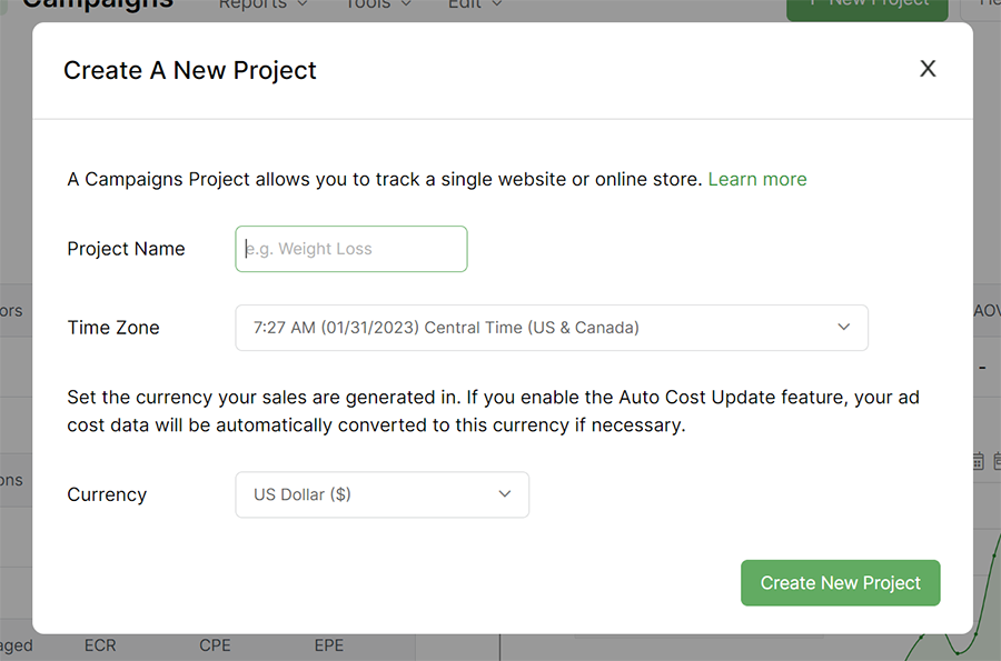 Next, each of your Projects have their own currency, which will override the system-wide currency. This is set when you create a new Project, but it can also be changed any time by editing the Project settings.
