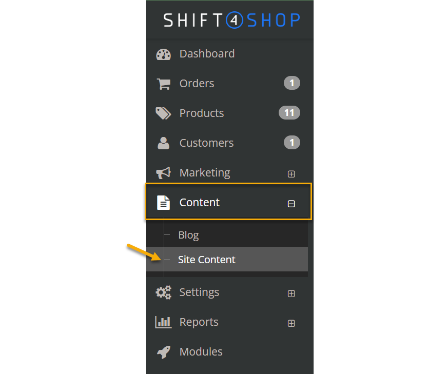 2. In your Shift4Shop dashboard, click “Content” on the left, then click “Site Content”.