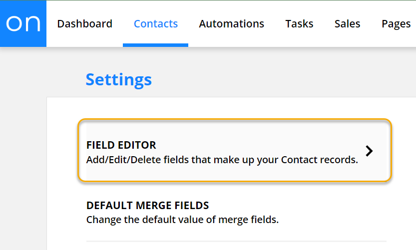 1. In Ontraport, click on Contacts and then click on “Settings.”
