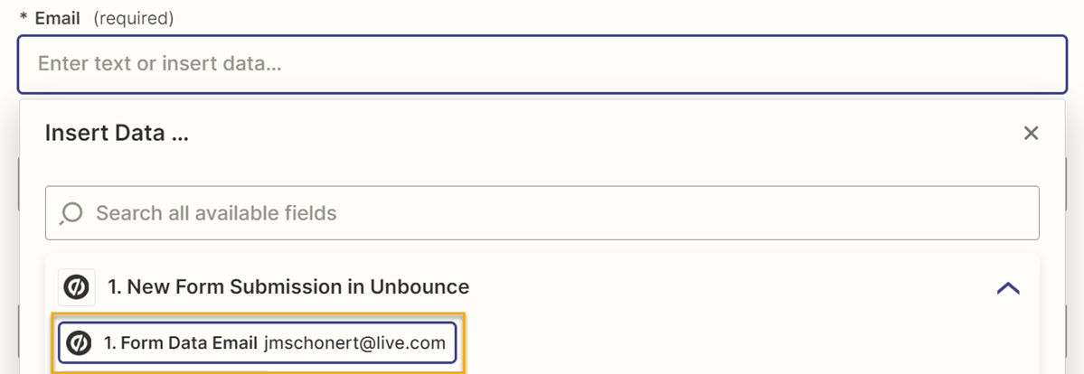17. For the “Email” field, click in the box and then select “Form Data Email”