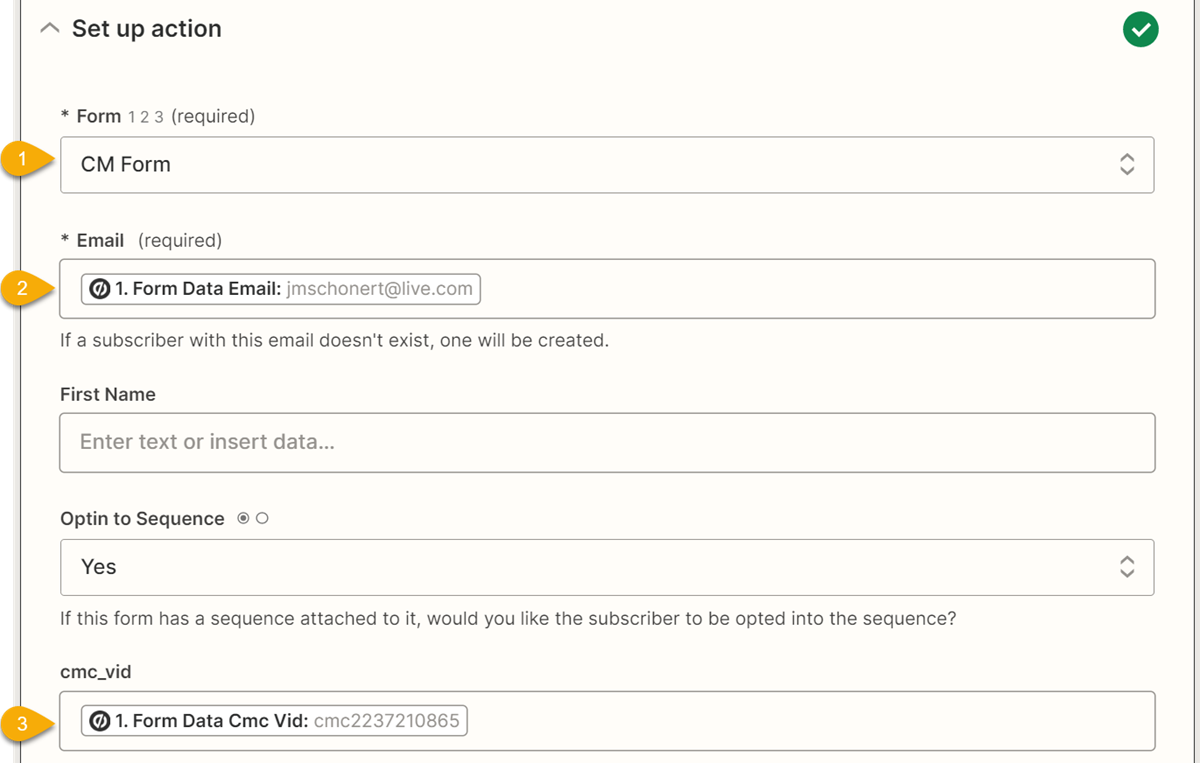 20. To set up the action, select the custom form you created previously, select “Form Data Email” for the Email field, and select “Form Data Cmc Vid” for the cmc_vid field.