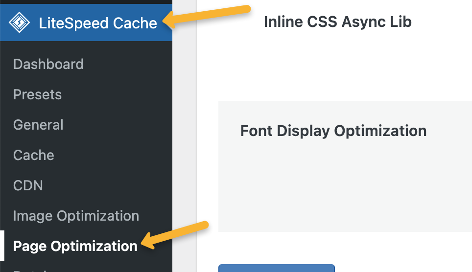 1. In your WordPress dashboard, go to “LiteSpeed Cache”, then “Page Optimization”.