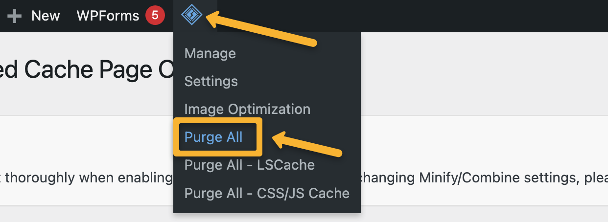 6. Hover over the LiteSpeed icon at the top of your Wordpress dashboard, then click on “Purge All”. This will clear the cache and update your pages.