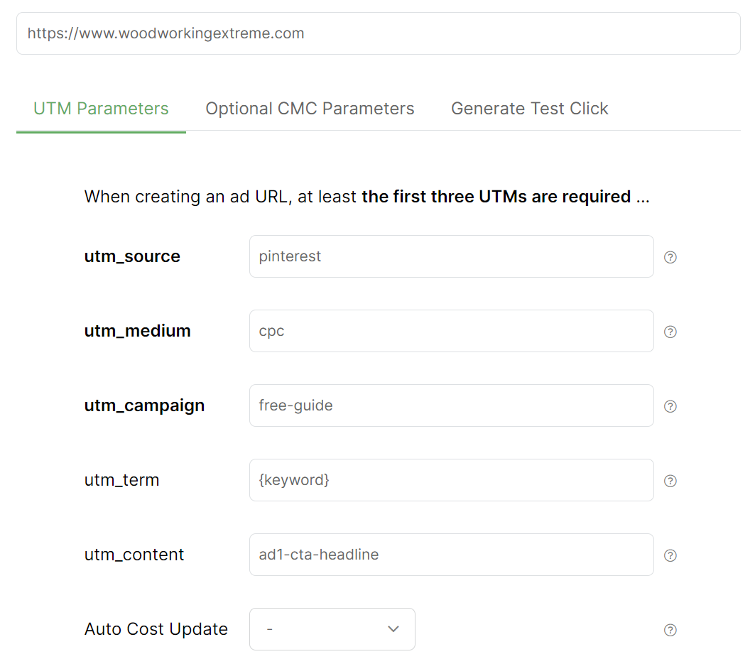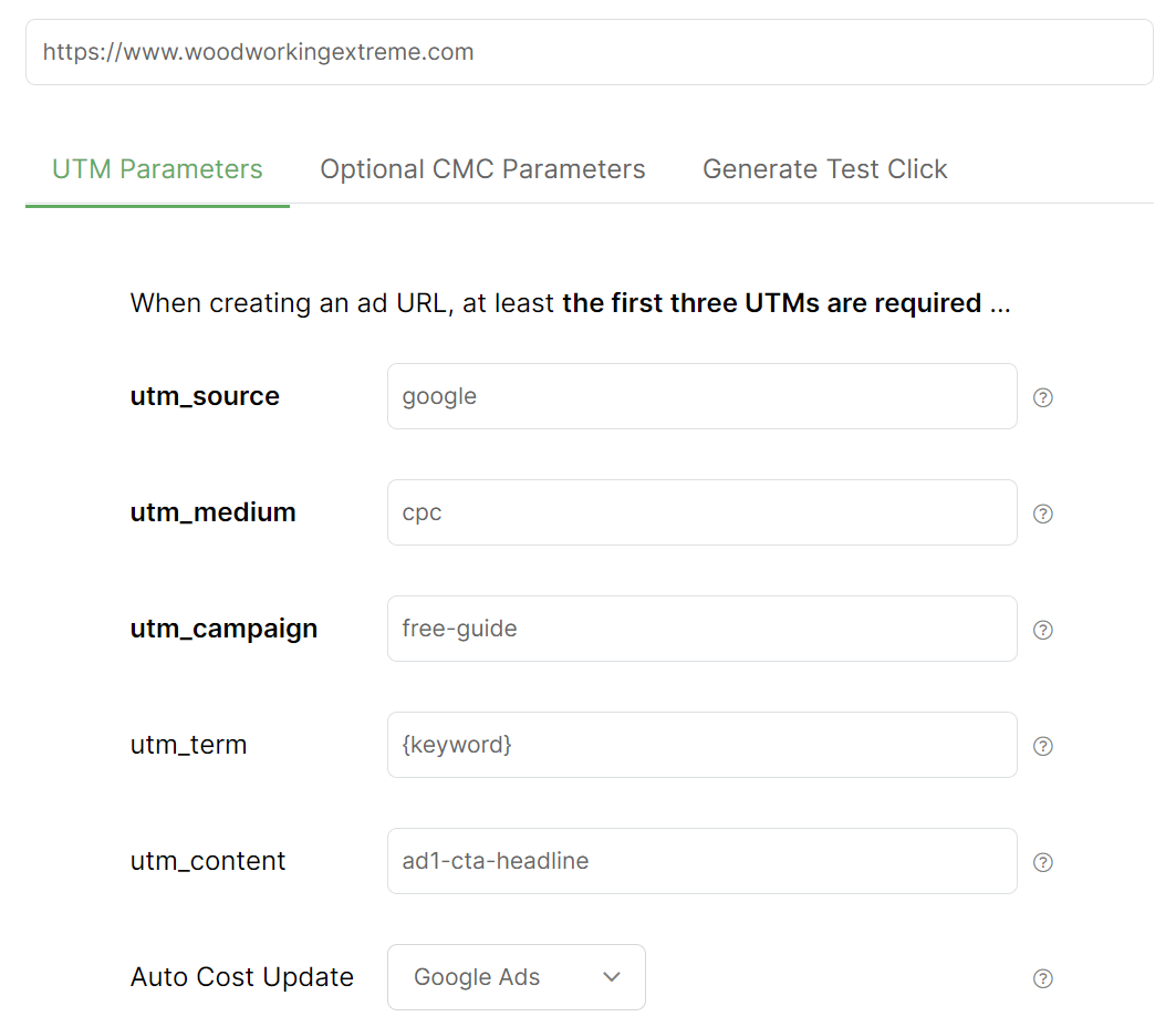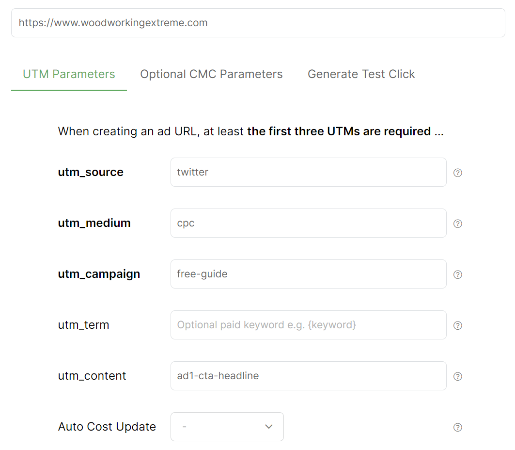 Enter the URL of your landing page, and then simply enter the UTM values you want to use to track this ad. You must always enter values for at least utm_source, utm_medium, and utm_campaign.