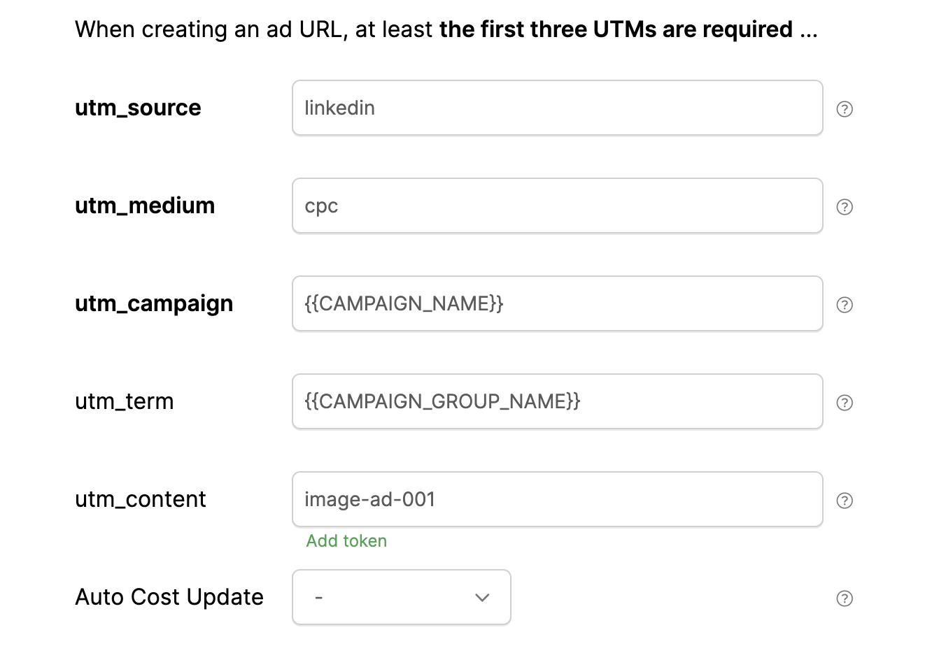 For LinkedIn Ads you’ll generally want to set utm_campaign={{CAMPAIGN_NAME}} and utm_content to the name of your ad.