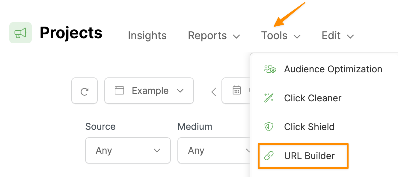 Click Projects at the top of any page, then click on the Tools menu and select URL Builder.