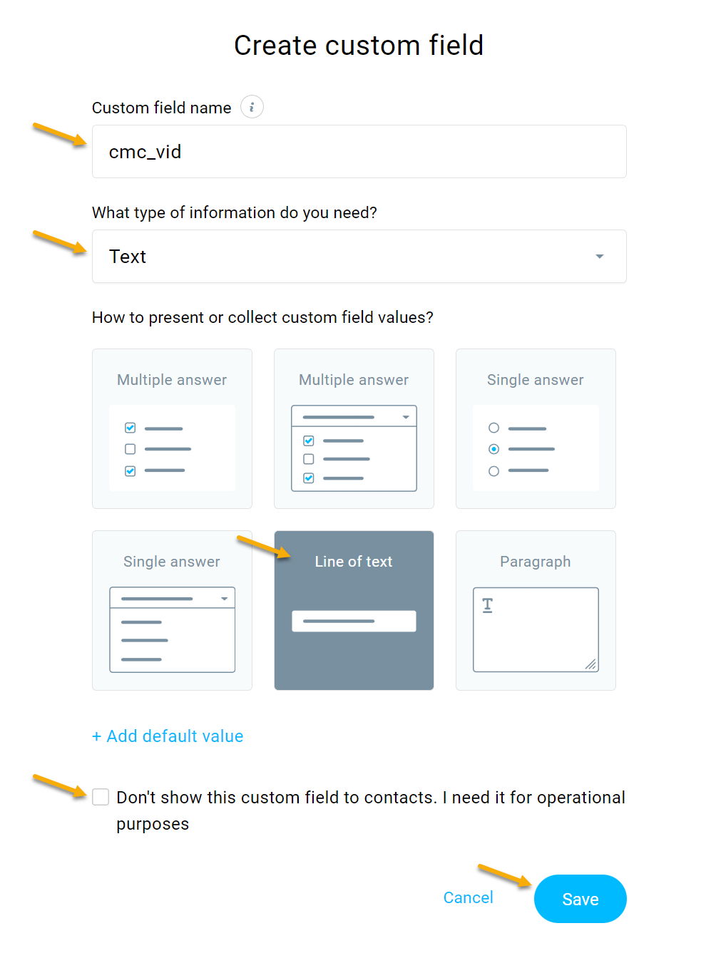 4. When creating the field, enter the value cmc_vid for the name, choose "Text" as the type, and choose “Line of text" for how to present or collect the custom field values.