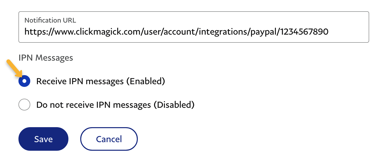 Click on “Choose IPN Settings”, then paste in the IPN URL you copied from ClickMagick earlier. Make sure “Receive IPN messages (Enabled)” is selected.