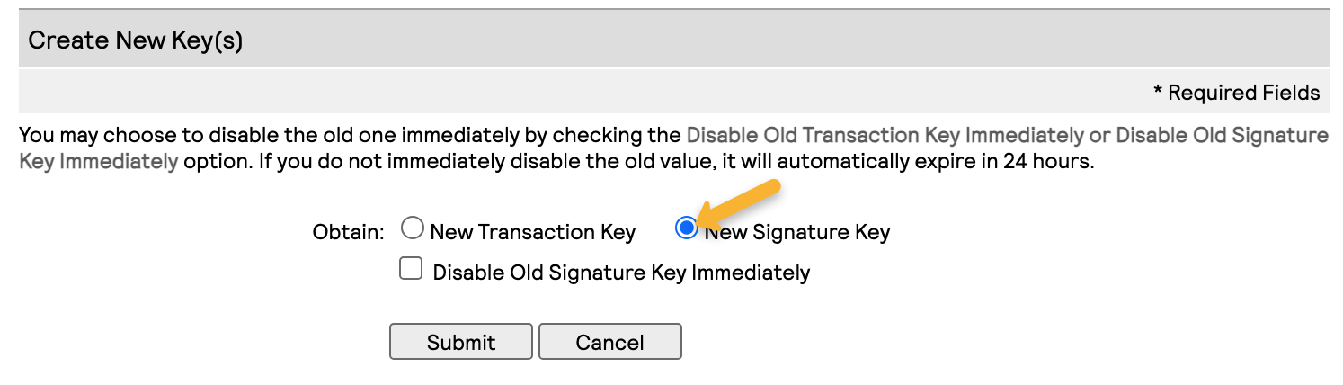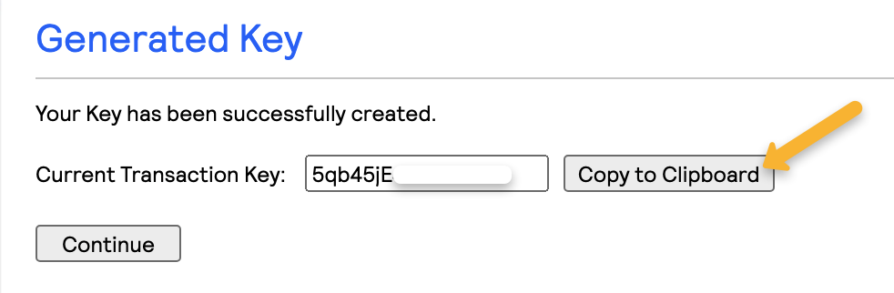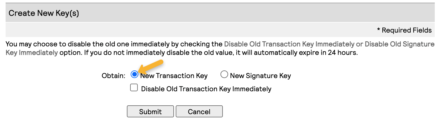 Once you’ve done that, head back to Authorize.net and select “New Transaction Key”, then click on “Submit”.