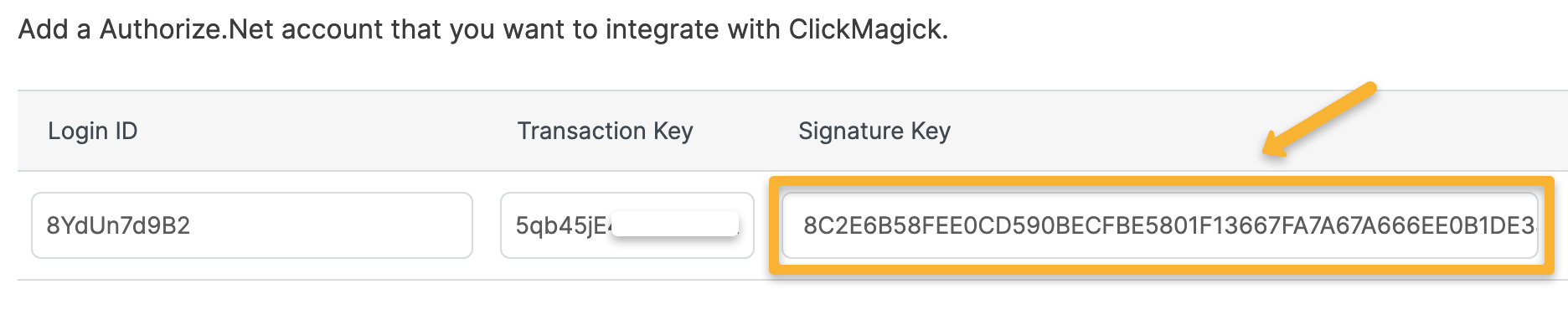 In ClickMagick, paste this Signature Key into the “Signature Key” box. Then click on “+ Add”. You can add as many different Authorize.net accounts as you need.