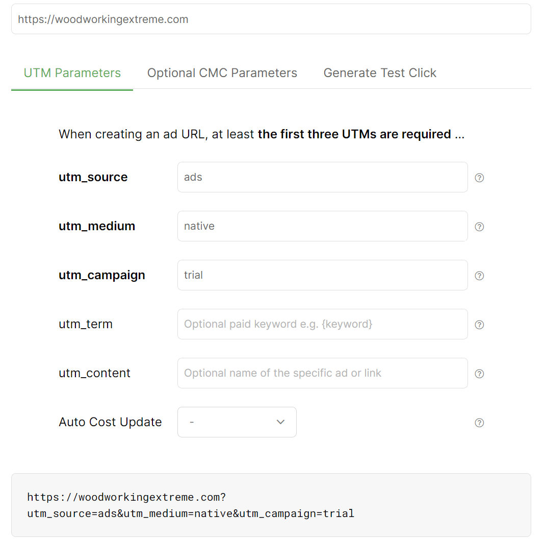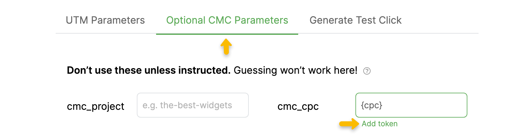 To track your ad spend with Taboola, click to the “Optional CMC Parameters” tab of the URL Builder, then under the cmc_cpc field click on “Add Token”.