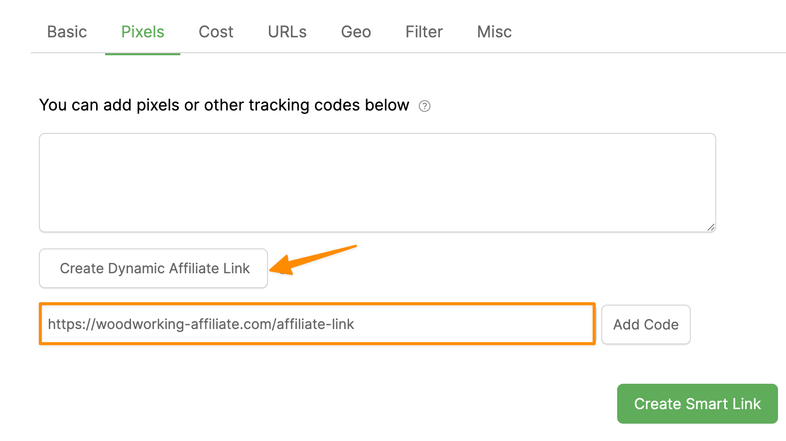 Click on the Pixels tab, then click the button that says “Create Dynamic Affiliate Link.” Enter your affiliate link in the new field, then click the “Add Code” button to generate and add your custom code to the Pixels settings.