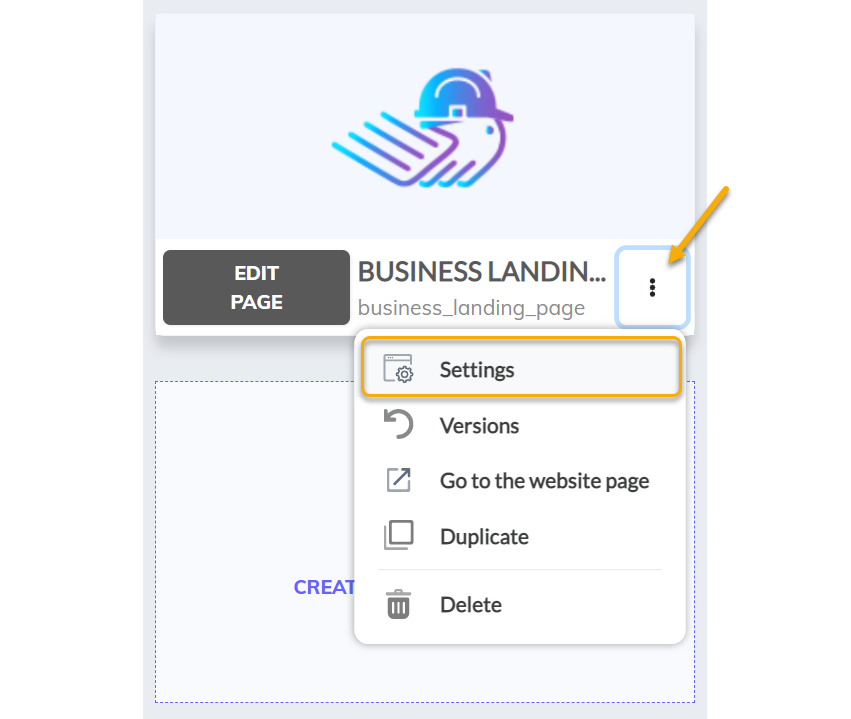 Go to the Builderall page where you want to add your tracking code, then click on the three dots in the bottom-right corner of the editor and click on “Settings”: