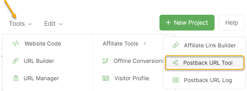 The next step is to generate your Postback URL using the Postback URL Tool. You can reach it from the Affiliate Link Builder, or you can always just click the Tools menu on your Project Dashboard, go to Affiliate Tools, and select Postback URL Tool.