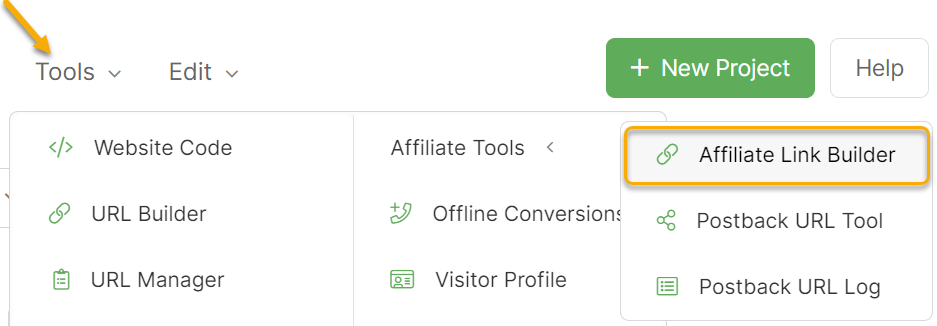Go to your Project Dashboard, click on the Tools menu, expand the Affiliate Tools menu, and click “Affiliate Link Builder”