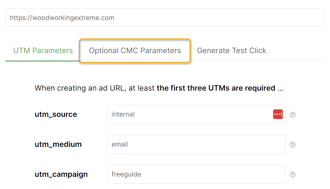 Add your landing page URL, fill in your UTM Parameters with the necessary information for your email campaign, and then click on “Optional CMC Parameters”.