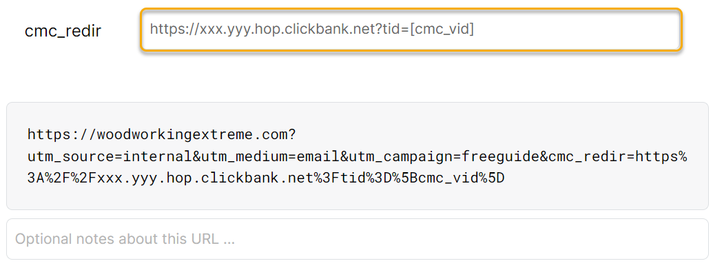 Add the affiliate link you modified above to the cmc_redir field and then copy your URL.