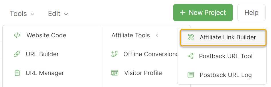 From your Project Dashboard, click on the Tools menu, hover over Affiliate Tools, and then select “Affiliate Link Builder”.