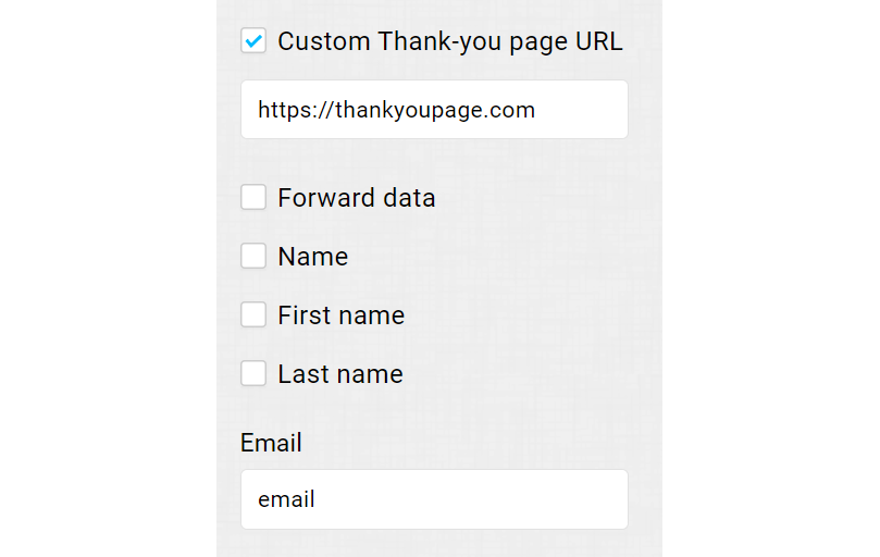 5. Check the box for “Custom Thank-you page URL” and add your URL to your thank-you page. Additionally, leave “Forward Data” unchecked, then if you are collecting names, check whichever of those boxes you want to use. For the sake of this article, we’re just collecting emails.