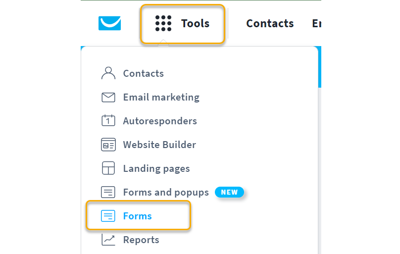 1. In GetResponse, click on the Tools menu and select “Forms”