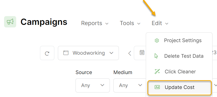 The final option is manually entering your ad costs by selecting the Update Ad Spend option in the Edit menu.
