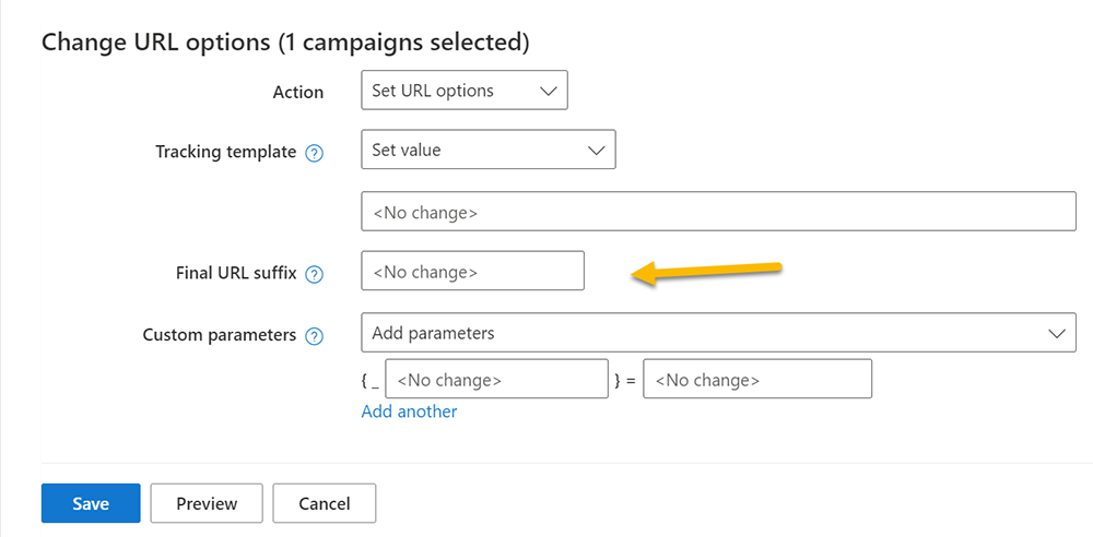If you have so many ads that updating the URLs for each ad is simply not practical, you’ll want to use a Tracking Template that is applied at the Campaign level in Microsoft Ads.